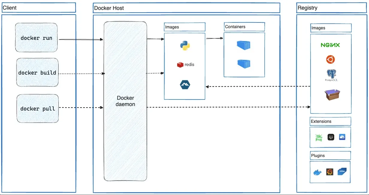 dockernos comunicamos con el demonio Docker para gestionar los objetos Docker con los que trabajamos. El cliente y el demonio pueden estar en equipos distintos. - Registros Docker: Un registro Docker almacena imágenes Docker. Docker Hub es un registro público que cualquiera puede utilizar, y Docker busca imágenes en Docker Hub de forma predeterminada. Podemos instalar en nuestros servidores registros privados.