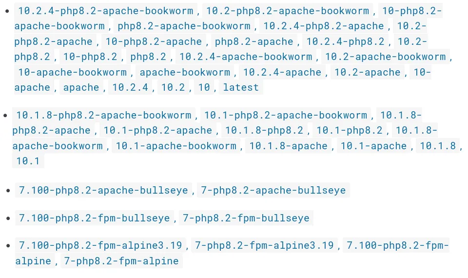 10.2.4-php8.2-fpm-bookwormestaremos creando un contenedor con la ultima versión de la aplicación pero que además tendrá un servidor de aplicaciones php-fpm para servir la aplicación. - Otro ejemplo: si usamos la etiqueta